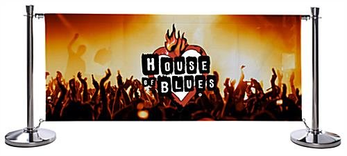 This outdoor café wind barrier has a versatile design which creates multiple area layouts. The custom banners are digitally printed. A wind barrier with full color graphics utilizes advertising space while acting as a crowd controller or a sectional for an outdoor dining area. These stanchion displays are available with single-sided printing. Each wind barrier is great for restaurants, bars or concert venues. Design the custom banners using our available templates. The displays have rubber padding to prevent floor damages.