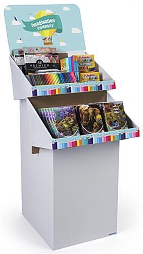 Create a personalized point of sale unit with this custom cardboard display stand. This stand-out marketing fixture includes full-color UV graphics stickers that are applied to the removable header and 2 shelves prior to being shipped. This floor standing cardboard display stand has a reinforced corrugated build for a quality point of sale fixture. Place bags of organic coffee, sunscreen bottles, or premium pasta on the tiers alongside graphics announcing brands or store sales. The floor standing, lightweight construction of this dump bin makes it ideal for showing off merchandise at any point of purchase location. This cardboard display stand combines 2-tier product placement with personalized marketing messages to entice customers and boost retail sales.