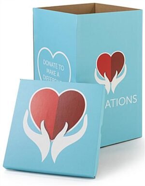 This custom printed cardboard trash box allows you to create a variety of collection solutions such as food or clothing donations, waste receptacles, or recycling containers. This floor standing 40-gallon bin has an overall height of 30” and 18.3” width and features a personalized top. The lightweight construction of this printed cardboard trash box makes it easy to move from one location to another. Featuring full-color 4 panel personalized graphics, this container also serves an excellent branding opportunity. Whether using for as a donation bin or an upscale waste receptacle, create something that will help attract the attention of guests, customers, or patrons. Think of this custom cardboard trash box as a blank canvas in which to design with your logo or message that will also be a low-cost and fully recyclable way to promote your brand. Made for indoor or outdoor use, once your event is over, simply dispose of for the ultimate convenience.
