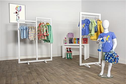 Design the perfect retail display with this modern cottage double carry clothing rack. Featuring two garment rails, arrange and showcase the best pieces from your boutique. The white double carry clothing rack includes two base feet for stability. Design a unique merchandising retail display with the two open hanging areas. Each garment holder includes a tall and a short portion, perfect for a variety of apparel options. Take advantage of the simplistic design and let your merchandise be the focal point with this double carry clothing rack.