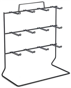 The black countertop peg display with a powder finish is a great addition for any retail environment! Use the wire rack to showcase up to a dozen different products such as key chains, jewelry, and souvenirs. The steel display includes 3 tiers each with 4 hooks to keep merchandise looking organized and professional. The wire rack also has an attached sign holder at the top to grab client’s attention with sales and promotions. Each of the twelve hooks is 3” long with a .5” upwards curve to keep your products from falling. Use the peg display to promote a variety of merchandise at your business!
