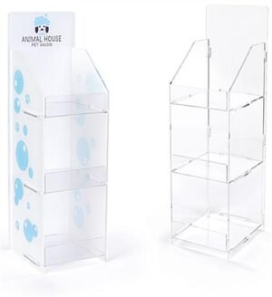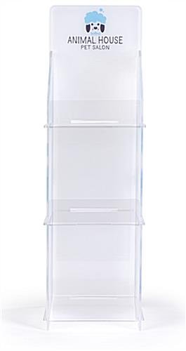 This printed countertop acrylic 3 tier shelf rack is great for merchandising with custom graphics. Choose to print on the header, back and sides. This printed acrylic 3 tier shelf rack creates a truly custom display for merchandising promotional giveaways or impulse purchases. The freestanding three shelf stand can help increase brand awareness and is perfect for trade shows. The custom display with three shelves is sure to draw the attention in any retail or event environment. Add this custom printed acrylic 3 tier rack now to your arsenal of marketing and promotional store fixtures.