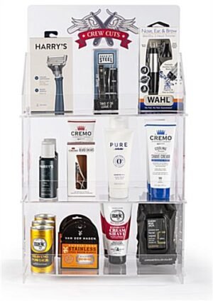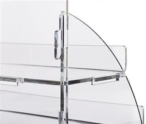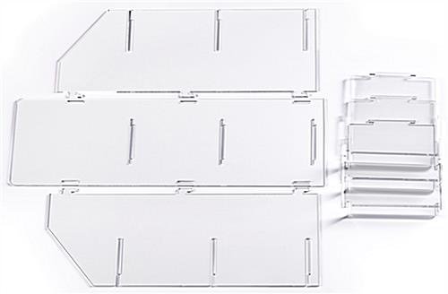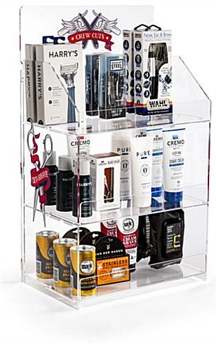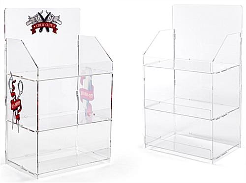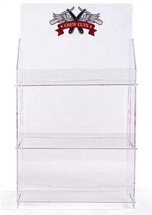 These branded acrylic portable tiered retail shelves give retailers the ideal opportunity to creatively display and promote their company logo. The store fixtures can feature your advertising when you customize this clear rack with your full color branding. Display these branded acrylic portable retail shelves at your next trade shows or convention. This clear rack is sturdy featuring easy assembly and breakdown features that require no tools. When you have the ability to customize the header, back, and sides, the possibilities for personalizing your store fixtures are endless. Place the branded acrylic portable retail shelves near your checkout area to become the perfect impluse item accessory.