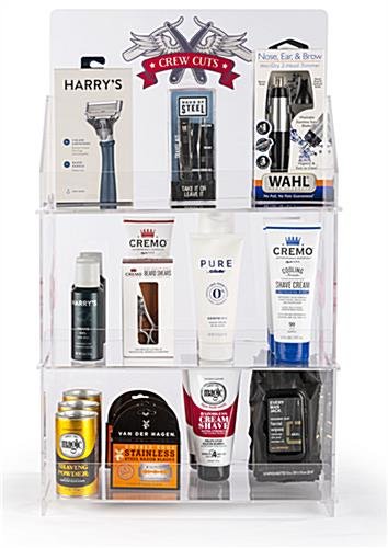Branded Acrylic Portable Tiered Retail Shelves with Header and Side Graphic Printing