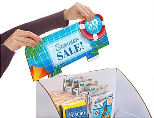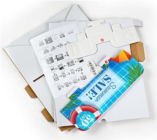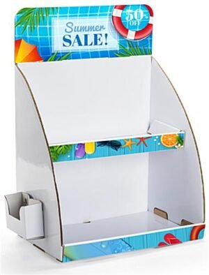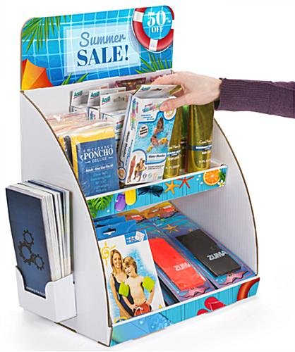 This 2-tier custom cardboard tabletop display stand is perfect for encouraging last-minute POP sales. Personalize the shelves and removable header with full-color UV printed graphics. The custom cardboard tabletop display stand has a corrugated brochure holder on the side to assist in dispensing literature to your patrons. This is an ideal POP opportunity to place your small retail merchandise on your sales counter. Add your brand messaging on the personalized removable header. Enhance your retail counter with the addition of this corrugated cardboard tabletop display!