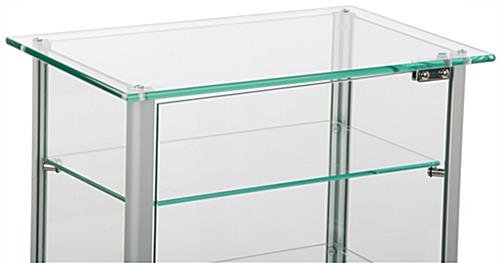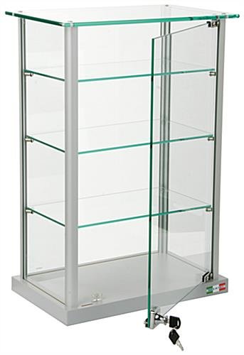 This glass countertop display case is equipped with (3) adjustable shelves to allow for a wide range of merchandise to be shelved within. Lock jewelry or electronics in this showcase then position it on a counter for easy viewing. Aluminum frame display case store fixtures hold merchandise on exhibit and prevent patrons from tampering with, damaging, or stealing items. Style and customize the arrangement of retail products within the locking showcases. Rather than keeping high priced items like jewelry accessible on acrylic risers or sample tables, store fixtures with a key and lock are an attractive and practical alternative. This display case is classified as part of the EuroVū series and is sure to make an attractive presentation in any showroom, specialty shop, or boutique.