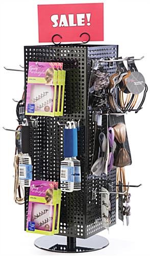 This countertop pegboard display with chrome hooks is four-sided. The spinner has perforated panels, much like gondola shelving, that allow the 60 included metal merchandise holders to be attached. The magnetic pegboard display can be placed in key areas of a retail store to attract customer attention and encourage impulse buys. Unlike traditional gondola fixtures, the spinner is four-sided and fully rotating so that customers can easily browse merchandise. Each pegboard display has a round base to keep the unit steady even in a busy retail store environment! Each holder is magnetic and can be used without the included merchandise wands to showcase metallic items.