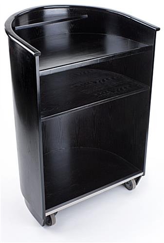 This speech podium is an ideal presentation lectern for any professional or executive presentation. These carts have a black veneer finish over plywood and have a curved front, giving them a sophisticated and polished look. This rolling speech podium, such as the portable lectern, has (2) rolling wheels that allow these stands to be moved if necessary. These wheels lock to ensure the stability of the lectern when in use. This speech podium also features two adjustable feet. This allows the pedestal to be adjusted in height to ensure stability on slightly uneven ground. This mobile lectern, a black speech podium is fabricated with quality materials and features two shelves on the backside of these stands. These shelves provide ample space to store speaking notes or any other presentation materials. This speech podium is a great lectern from which speakers can address audiences of any size! Ideal for public speaking, these professional stands are sure to please!