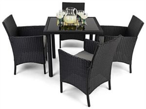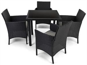5-Piece Synthetic Rattan Outdoor Dining Set w/ Tempered Glass Top and Cushioned Seats