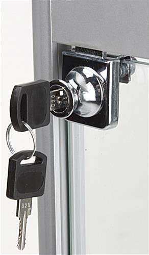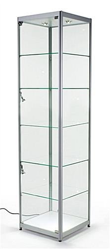 Setup a showcase focal point with this silver LED display case suitable for jewelry, collectables, or other high end merchandise in a stylish manner. An anodized aluminum frame provides a contemporary housing to (4) 6mm thick tempered glass shelves. In addition to the 2 top lights, each locking display case features 4 other bulbs evenly spaced to provide front and back lighting to your products. An included lock and key set enables you to keep your merchandise safe from prying hands. Each unit contains leveler feet underneath to keep your display case even wherever you use it. With back lighting and tempered glass, this container is perfect for showcasing materials in any business or retail store.