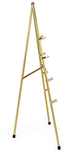 This brass easel is commonly seen in hotel lobbies and convention centers. The tripod design features a high quality steel construction with a brass plated finish. This brass easel is 6′ tall making it the ideal size to display such items as posters, artwork, menu boards and other signage. Display directories, messages or paintings at various heights. Each brass easel has a fixed height of 6 feet tall; however there are support brackets at four heights. Users can choose to set the bottom of a display as low as 24″ off the ground or as high as 54″. Each brass easel can be easily folded up and stored.