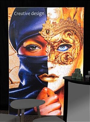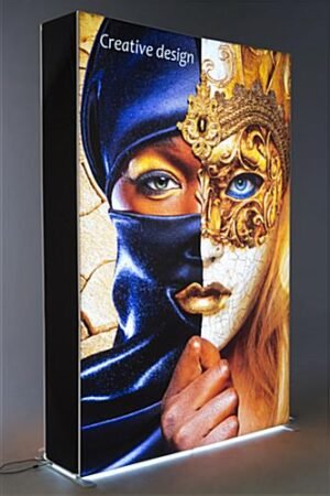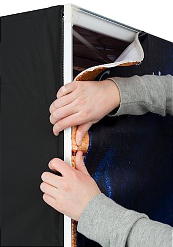 This double-sided replacement SEG graphic for HK75W includes 2 5’ x 7’ custom dye sub printed fabric pieces along with a black side panel. These personalized polyester prints are designed for use with an existing backlit wall display. This replacement silicone edge graphic for HK75W is flame retardant and is sure to drive traffic to your booth at the next trade show.