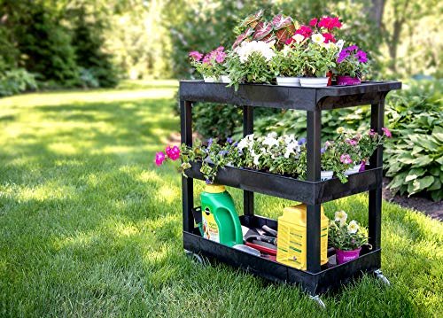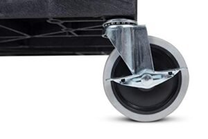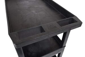 - Has an ergonomic push handle molded into the top shelf. Four 4″ full swivel casters, two with locking brake.