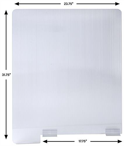Use our countertop extended hygiene barrier to section off or divide high traffic areas to prevent the spread of aerosol-based viruses within banks, restaurants, checkout lines, and reception desk spaces. Each polycarbonate splash shield includes a set of two durable feet connectors and high-tack adhesive strips to keep this divider safely in place with two inches of overhang from its installation point. This countertop extended hygiene barrier with clear 0.236″ thick panel features a translucent corrugated design for an added layer of privacy. Conveniently clean this protective divider using warm soapy water or wipe down with a mild cleanser and micro-fiber cloth between customer visits. As an added benefit, each countertop extended hygiene barrier is easy to install without the use of any tools. Place this polycarbonate splash shield with clear panel within your space to ease the concerns of employees and customers while enforcing social distancing regulations.