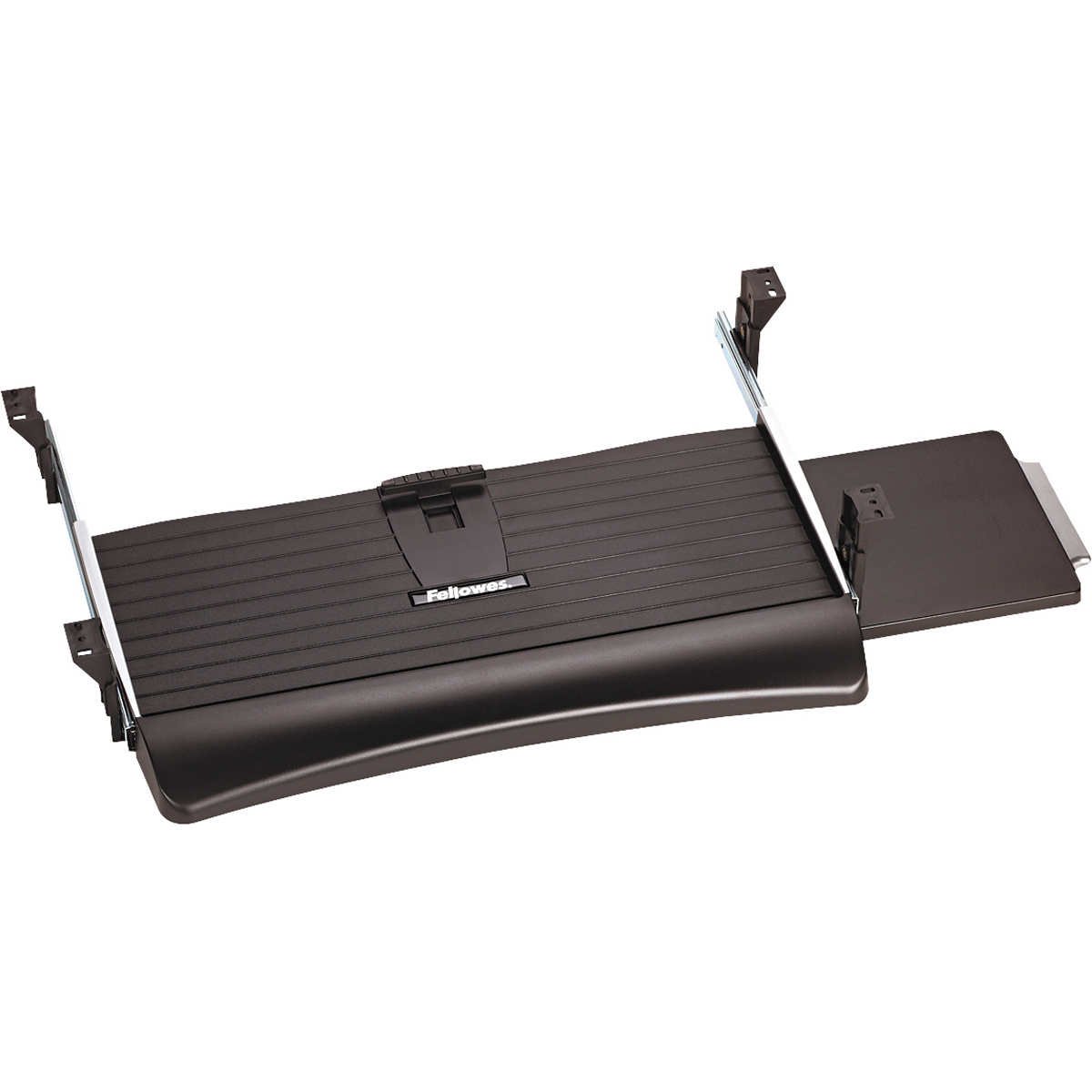 - Mouse tray mounts to right or left side of keyboard tray or stows underneath