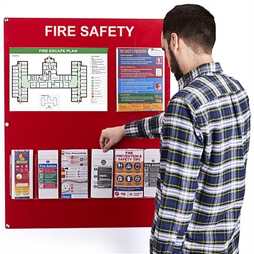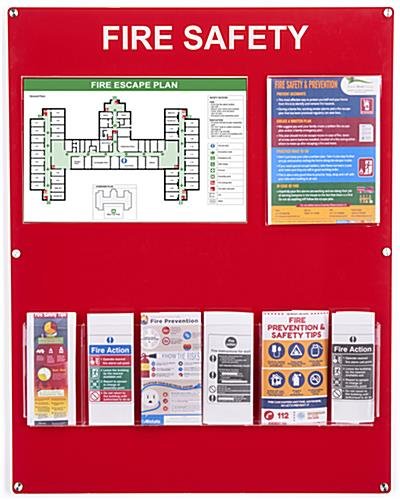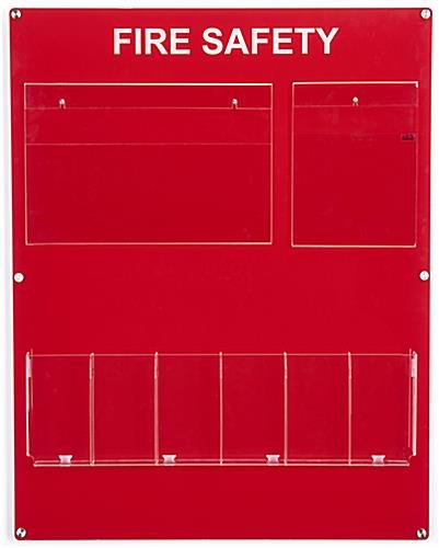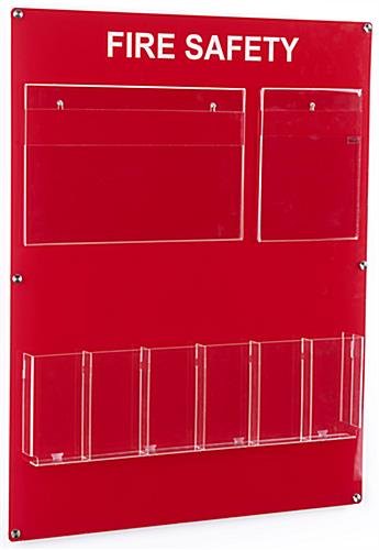 This acrylic mounted fire safety information station holds all the necessary information to lead guests to safety in the case of an emergency in your facility. The clear sign holders come in two sizes: large-format 17″ x 11″ for evacuation plans and 8.5″ x 11″ for other announcements and flyers to educate your visitors, students, or workers. Six brochure pockets allow for additional reading materials that can be easily resized with the adjustable dividers for larger publications. Steel standoffs keep your board secured to nearly any wall. Use this red mounted fire safety information station with pamphlet holders in your establishment for the protection of valued staff and patrons.