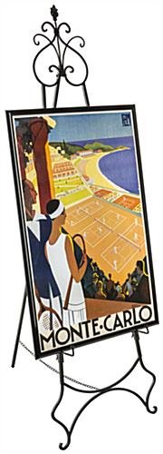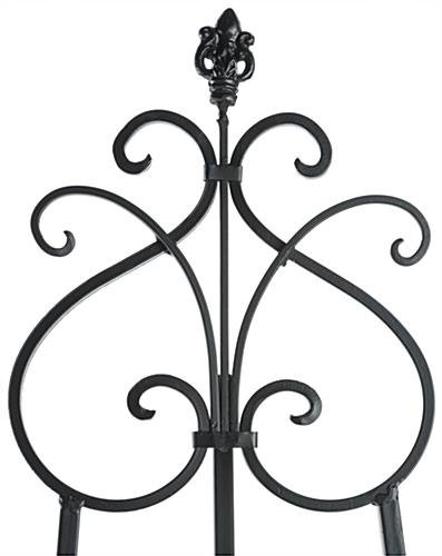 This adjustable wrought iron easel provides two designated holders to display art simultaneously. Including two sets of height modifiable hooks, these decorative display stands can accommodate one large portrait or multiple paintings at once. Showcase an event poster, artistic painting, keynote speaker announcement or informational sign on the ornate floor standing easel. To better inform you in preparation for a presentation, the bottom hook set provides a height range of 10.5″ – 33.5″, while the top hook set ranges from 35″ – 55.5″. Designed with a scroll design decorative topper, these display stands are sure to make a stylish impression no matter what décor it is placed into. Sturdy, yet lightweight, each easel easily collapses and can be carried without hassle. Equipped with a safety chain, these holders offer a durable way to exhibit artwork meant for indoor use, that is sure to attract attendee’s attention!