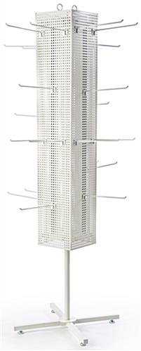 This white pegboard display rack has a glossy finish to match existing store fixtures. Each rotating stand is freestanding with an X-shaped base for stability. Each floor standing display rack has four magnetic panels that are perforated for use with peg hooks which can be purchased from our website. With these store fixtures, retailers have multiple options for product placement. The display rack can stand in high-traffic areas such as entrances and exits, or the unit can be placed near the checkout to encourage impulse purchases. The four-sided, rotating design ensures that patrons will notice the merchandise no matter which direction they are approaching from! The coil-style sign holder included with the stand allows store owners to advertise special prices and product information.