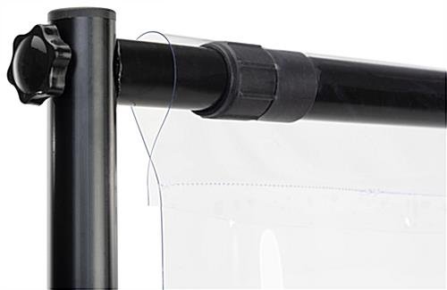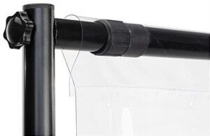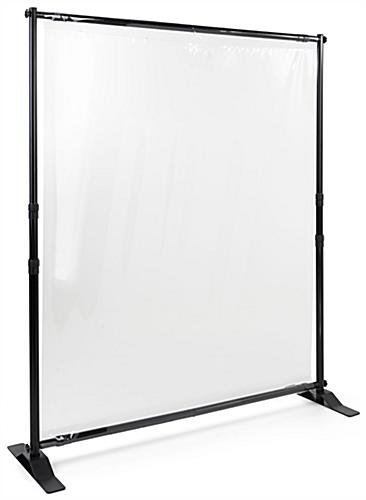 This sneeze shield room divider is perfect for aerosol-based virus protection in gyms, restaurants, offices or schools when social distancing may not be possible. The floor standing portable frame comes with a transparent vinyl partition and can easily be repositioned in any environment without obstructing views. Quickly assemble this lightweight sneeze shield room divider without any tools by simply sliding the durable clear banner over the black aluminum poles. While portable and lightweight, the two wide feet ensure this protective partition will stay firmly planted in high-traffic environments such as trade shows or theaters. The 55.5″w x 72″h transparent screen is tear-resistant and waterproof, allowing for daily sanitation with mild soap-based cleansers. A canvas bag for portability and storage is also conveniently included. Use this protective sneeze shield room divider as a safe substitute for social distancing in any environment where employees or patrons are present!