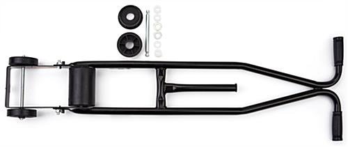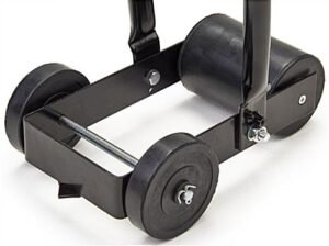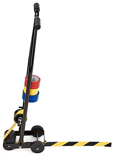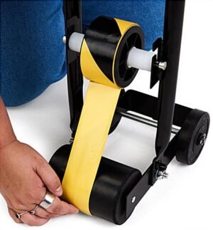 Our floor tape applicator comes with two 3 1/8 inch axle-mounted rubber wheels and one 3 inch front wheel, making it easy to maneuver and create restricted areas at event venues, construction sites, and outdoor spaces without compromising your back by bending over. This walk-behind dispenser is made from durable powder-coated steel and constructed to stand up to years of use indoors and outdoors. Each easy-to-use walk-along floor tape applicator conveniently folds flat for easy storage after designating safety zones, marking flooring of specific retail store displays, and distinct standing-room-only sections at concerts. The dual comfort grip handles provide a pleasant and straightforward experience when you maneuver the walk behind dispenser to display clear visual cues. The walk-along unit has an attached metal guide that ensures tape with a 4.5″ width with a 3″ core diameter will make straight and exact lines. This line marking floor tape applicator has a center pipe that holds extra rolls for refilling so that communicating designated areas for employees and visitors in warehouses or offices can be done quickly and efficiently.