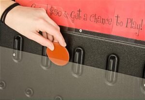 This prize drop game board is ideally meant to be used within a tradeshow or a retailer’s exhibit. The gaming display draws in a crowd due to its “plinking” noise and large size. The prize drop game board, also known as a carnival game, works well to supplement a current promotion or to encourage more visitors to enter your facilities. Why not use the gaming system to persuade shoppers to spend more money? For example, the more dollars spent, the more opportunities to play! This prize drop game board is derived from the popular American television show, The Price is Right. Each contestant is given a flat round disc to drop inside a gaming fixture. The prize drop game board is equipped with 68 pegs, dispersed throughout the display in an offset design. Once a disc is dropped, it will ricochet against the pegs until landing in one of eight winning prize sections! The carnival game is based purely on luck, but has an uncomplicated design anyone will understand. This gaming fixture will be recognized instantly as a sensational activity, everyone will want to play!
