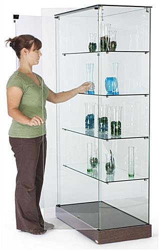 These store fixtures, rolling frameless tower displays stand apart from the competition with many useful features. The cabinets are extrusion-less, providing a clear view of displayed merchandise. All glass is tempered, making it stronger and more resilient to breakage than traditional glass. It is much less likely to break, and if for some reason it does, it will shatter into small, manageable pieces, rather than large, dangerous shards. Non-locking wheels are hidden beneath the cases’ base, allowing retailers to move the showcase as necessary for store rearrangement or to access the back of the unit. Two full-height, swinging, locking doors provide quick & easy access to the interior of the cabinets, to authorized individuals only. The four full-length glass shelves are set at fixed locations, but there is some variation in the clearance of shelves, allowing retailers to display items of varying heights. Please note the following about these showcases: