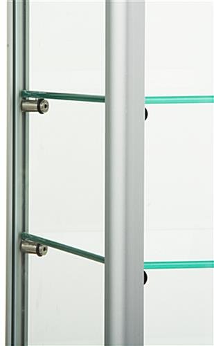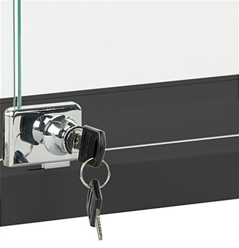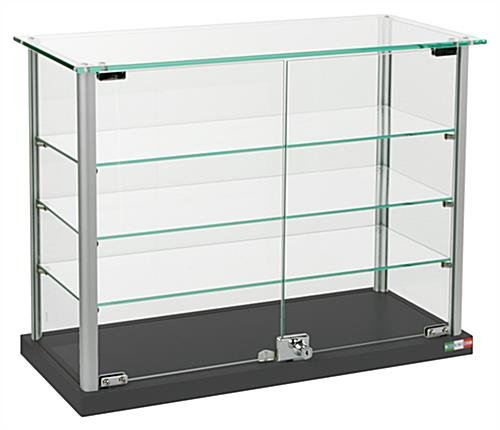 This countertop display case prevents patrons from fulfilling a self serve type of shopping experience. Rather, customers must request assistance before touching merchandise which is ideal for high priced, valuable, or breakable items. Lockable display case store fixtures can be conveniently positioned on a counter allowing products to be at eye level for browsing consumers. Two swing open tempered glass doors provide easy access when removing items for further review by patrons before making a sale. Additionally, if necessary, the three shelves are height adjustable and removable for added space and versatility when arranging a showcase. Each case with aluminum framing, black veneer base, and tempered glass canopy is compatible with any retail counter lay out.
