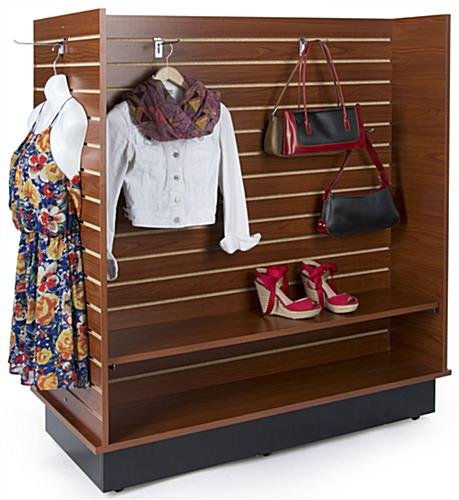 This slatwall display unit will bring functionality to your retail store with its 4 sides. The cherry gondola features 15 channels per side with 3” spacing in between each. With hidden casters underneath, the retail store display unit can be effortlessly moved around. Its large size and durable melamine panels make this piece a necessity when promoting your products. The display unit features a 51”W x 55”H H-shape design. This fixture is compatible with most standard gondola accessories.
