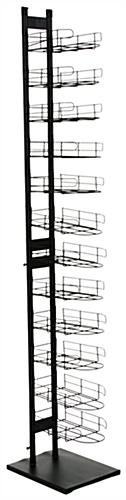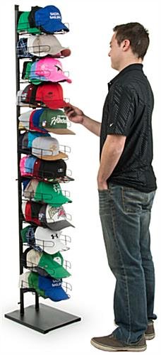 This baseball hat rack is great for point-of-sale use in retail environments. The display is designed to complement existing store fixtures. Each floor standing rack is black with (12) pockets to provide plenty of storage for merchandise, as well as two sign grippers for advertising the products. The cap holder can accommodate approximately (96) to (120) snapbacks when fully stocked. An impressive storage capacity allows for many varieties of lids on the rack. In addition, each cap holder has a sturdy rectangular base to keep the shelf upright and a neutral matte black finish for use in any store.