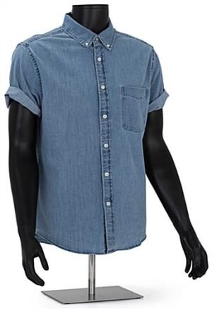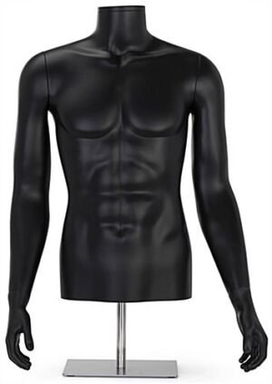 This mature male half-body mannequin is a modern and unique visual merchandising display solution, perfect for showcasing shirts, sweaters, or jackets in your retail space. Made of durable recyclable polypropylene material with an attention-grabbing matte black finish, our abstract torso figure will be sure to grab the attention of your audience while allowing your best-selling garments to be the main focus of any presentation. Ideal for busy environments such as boutiques, showrooms, retail stores, and shopping centers, each male half-body mannequin with headless design features a weighted metal base that securely keeps this fixture mounted in place. Each tabletop merchandising display is constructed with accented muscles and fully formed hands, giving off a realistic appearance that allows customers to visualize how the apparel would look like on the human body. Removable arms and a height-adjustable pole ranging from 23.25″ to 39.5″ tall allow this lightweight male half-body mannequin to be easily dressed and modified to meet your merchandising needs. Stage our headless tabletop torso figure within your establishment to create a fully modernized visual showcase that will make your best-selling merchandise stand out!