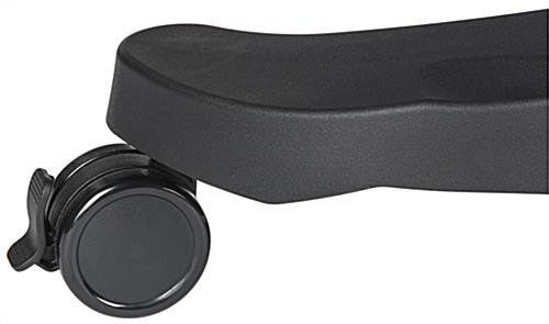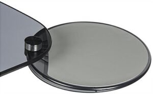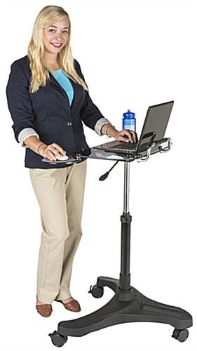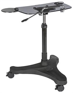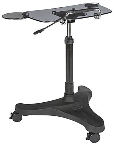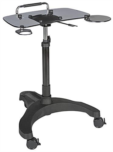This rolling laptop workstation adapts to business or home office needs with an adjustable shelf allowing you to sit or stand while using your computer. The smoke colored tempered glass shelf fits notebooks up to 17” for a durable desk surface. Attach an electrical strip to the power bar slot built into the black base of this all mobile laptop workstation with the included adhesive hook and loop strips for increased charging capabilities of your electronics. Once you have this adjustable desk in the perfect spot, the 3 casters lock in place for a steady surface. Using a single handle lever and black knob easily move the glass shelf on a gas spring lift pole for a height range of 29.9” to 40.2”. Ergonomically designed, this computer stand includes a retractable cup holder and mouse tray which can be assembled for either right or left handed users. Maintain comfort while using your notebook in a home office or cubicle with this laptop workstation!