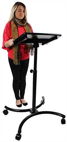 This adjustable laptop stand, known as a computer shelf, is an ideal display for use at trade shows. Each desk can be adjusted to different height settings for ideal use. This height adjustable laptop stand has a matte black finish that will nicely mesh with any décor, and the steel base has a nice curved design. This desk comes with (4) wheels for mobility. Two of the wheels on this adjustable laptop stand that is mobile are locking, making this display stationary when necessary. This computer accessory has an ergonomic design to help improve efficiency. Users can also change the angle of the surface on this adjustable laptop stand that is for residential use.