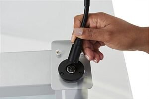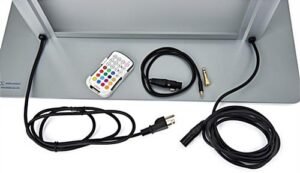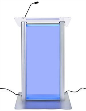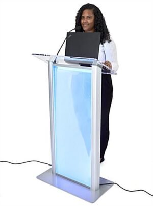 This illuminated frosted acrylic lectern features 16 LED colors and multiple light-up modes to help a presenter capture, hold and maintain the attention of the audience during a presentation. Our LED illuminated lectern has a 26.5″ by 15″ top platform and a 1-inch book-stop for a laptop or notepad during your presentation at conferences, fundraisers, and award shows. This podium has a durable design with aluminum poles and a steel base. The light-up design will attract trade show attendees to your booth. The angled 12mm thick counter features a microphone socket for easy audio setup (mic sold separately). Our LED illuminated lectern is a modern presentation tool for conferences, ceremonies, and award shows.