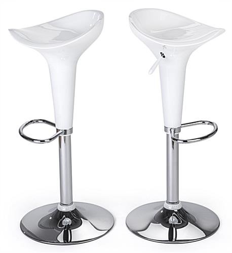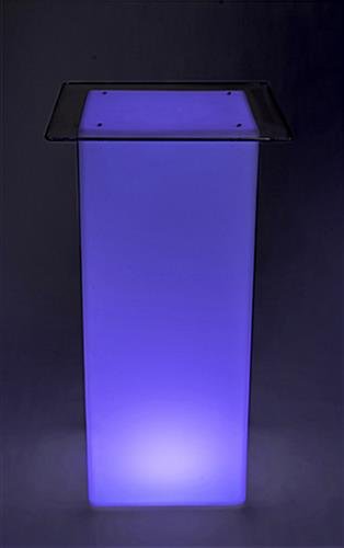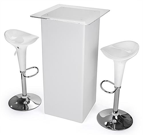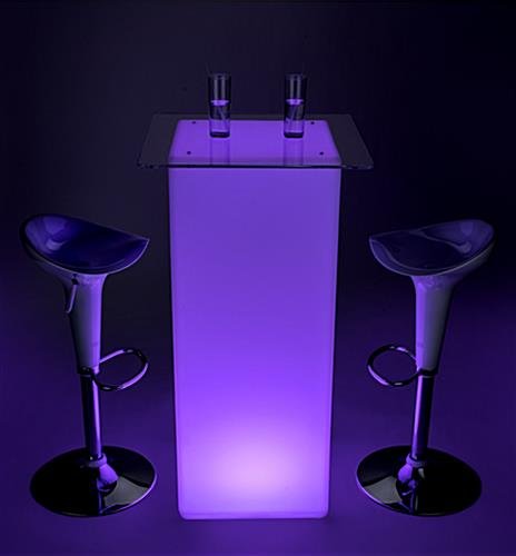 This LED tall boy bar table set makes it easy to add the ambiance of illuminated furniture to your lounge or special event. The group of 3 pieces includes the pub height tabletop and two white ABS stools. A 12-hour built-in rechargeable battery is included with the LED bar table set. There are 16 light color options plus dimming, fade and flash effects. A glowing LED tall boy bar table set is the perfect furniture for trade show booths, events, bars, and even outdoor venues. The modern pneumatic pub height stools are height adjustable from 24”-32”, and rotate 360°. The pub-height illuminated table is IP45-rated water and dirt resistant so it’s perfect for fun outdoor cocktail parties or to liven up a bar setting.