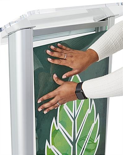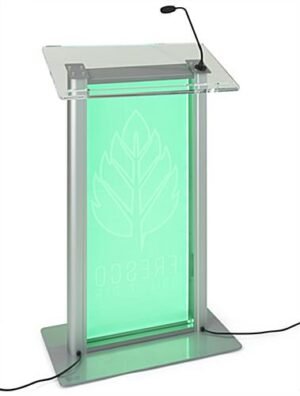 This custom LED clear acrylic lectern will attract conference attendees to your business presentation, booth, and Q & A sessions. The light-up design will illuminate your podium and personalized graphic to help stand out amongst the crowd. This illuminated custom LED lectern includes a microphone socket (mic sold separately), AC power cord, and switching cables for a hassle-free setup before your presentation. The podium features a full-color graphic to further identify your company’s presence at the next tradeshow. Choose from 16 different light-up colors to best match your personalized sign. Our custom LED lectern is an ideal podium with graphics for any business, university, or church.