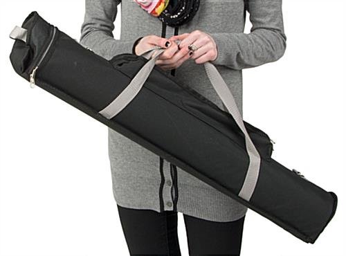 A retail banner stand is a portable tool for advertising different products and services at events such as a trade show or an exhibition. The displays post is shipped with a sturdy black canvas carrying bag with 3 straps and 2 pockets to hold all of the necessary equipment. With only 3 pieces of hardware, this L-shaped banner stand takes only minutes to assemble and put up for a trade show and other events. The support is constructed of a single platform as the base and sits upright when the vertical rod is pulled taught by a graphic.