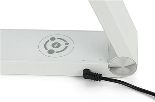 Give this personalized charging desk lamp to employees as a corporate gift that features your custom printed logo. This decorative white light with wireless charging is trendy and combines illumination with convenience. This personalized charging desk lamp features two USB ports, a touch sensor, a dimmable LED bulb, and it folds into a cool triangle shape. These features make this light an excellent prize at a trade show or a reward in the office. Corporate gift-giving just got more comfortable with this custom LED illumination fixture that’s branded with your custom printed message. This modern white personalized charging desk lamp is sure to be a stylish addition to any business meeting room, reception desk, library, or college workspace while also advertising your business.
