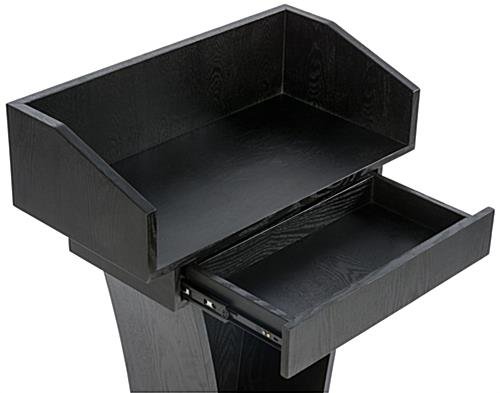 This restaurant entrance podium is a floor lectern that can be used at a number of venues. The black hostess station includes a large semi-enclosed reading surface. Each modern hotel podium is designed with a black wood grain veneer finish. Tuck away and store materials in the open storage area at the base of each floor lectern, great for holding various items. Each podium has a 1 drawer, complete with the coordinating wood finish, for keeping items out of sight but still within reach. The hostess station is constructed from MDF and stands at 43.25” tall, ideal for any individual’s height and designed for longevity.