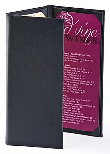These leatherette restaurant displays, bar menu covers have 3 panels that are designed to hold (1) 4-1/4” x 11” sheet on each side. The trifold has the back panel folded onto the middle piece and then the front cover folded on top of that. Bar menu covers that have 3 panels are ideal for wine tasting menus or for on tap selections. Besides using this display to show wine listings, these trifold folders can also be used to promote dessert menus or weekly specials. Each of these bar menu covers that are for 4-1/4” x 11” also come with angled corners that give wine listing sheets an upscale look. On top of it, the corner tabs at the side also helps to securely hold the pages in the folder and prevents them from coming out of the booklet. Printed sheets can easily slide into the bar menu covers that have four album corners. Use these leatherette displays to present your drink listings to patrons!