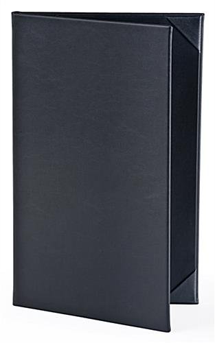 This menu book, known as a restaurant list display, has a hardcover design that is ideal for upscale restaurants. These cafe selection holders can be used for wine and drink lists, or daily specials. This menu book that holds (2) sheets of paper has a prestigious look, with its textured, faux leather design. The lists are held in place by the photo album corners. Simply slide the corners of the correct size sheet into the menu book, and tuck them underneath the photo album corners. These list holders can easily be wiped clean, making it easy to remove stains common to the food service industry from the outside of the covers. This menu book that can be used for wine lists has a matte black finish, ideal for use within any type of eatery.