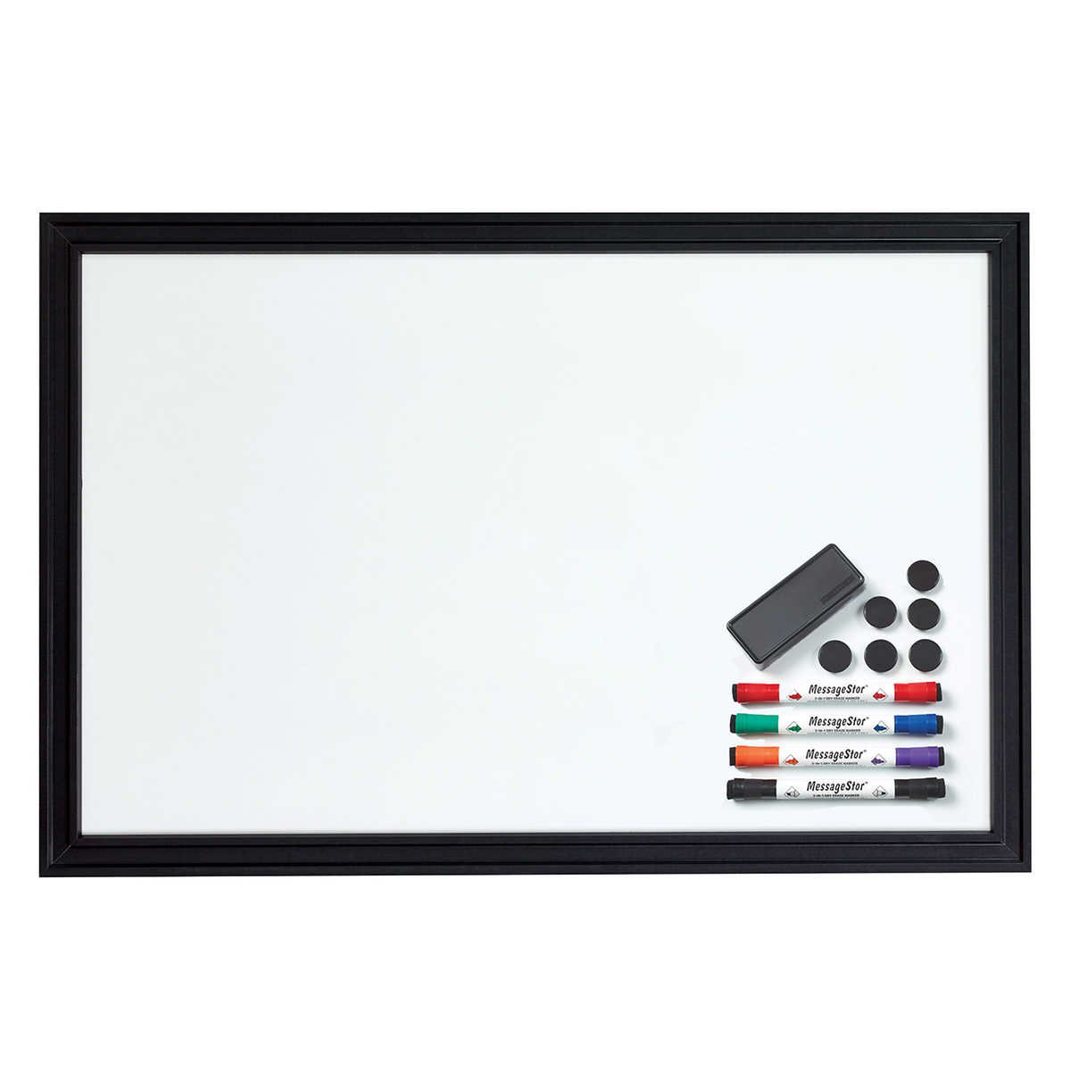 - Includes; 1-magnetic eraser, 4-double ended magnetic dry erase markers, 6-round magnets