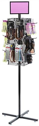 This rotating grid rack is a floor display ideal for retail store environments. Constructed from black metal wire, each stand is fully revolving. Utilize the grid rack display with hooks or pockets (not included with purchase) to complete an impulse shopping station. Advertise sales and deals with the top loading removable sign holder. Equipped with 4 base levelers and 4 optional casters, the grid rack is versatile in design allowing for a spinning stationary or mobile floor display stand. Square center wire panels provide 4 panels to spin and showcase retail store merchandise simultaneously.