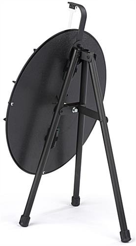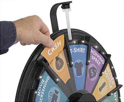 Bring excitement to your next trade show event with this mini spinning raffle wheel. Featuring flashing lights and a medium clicker noise, this contest spinner is sure to grab the attention of passersby. Each lightweight spinning raffle wheel has twelve slots to insert custom graphics in a design that best represents your company. The small form factor allows this unit to sit on tables and countertops without taking up too much of your trade show or event space. Design your custom graphics with the included templates that can be downloaded below. Additionally, each spinning raffle wheel comes with six AAA batteries so it’s ready for use right out of the box!