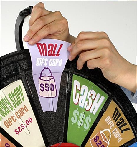 Each of these game wheels features 12 customizable reward slots and a center signage plate for your graphics, prize description, or message printed straight from your own printer. We provide these prize wheels with sign templates necessary to print your prize messages. This fun game wheel easily re-configures for multiple event use. Simply change the wheel segment inserts and the center circle logo.