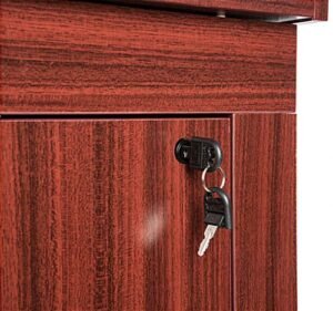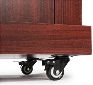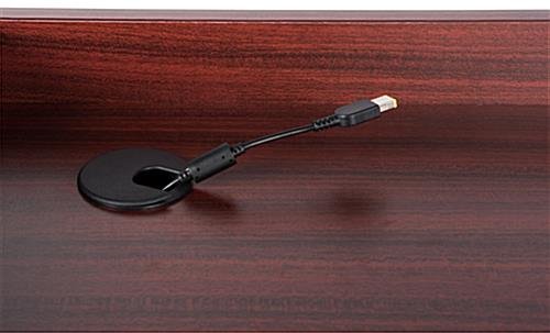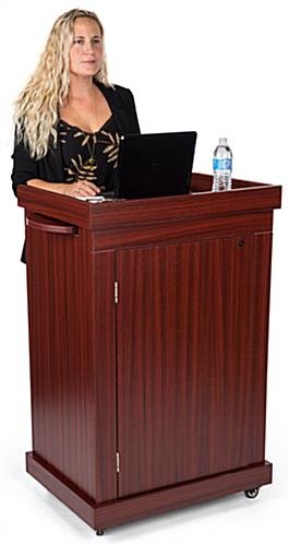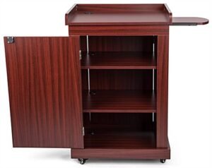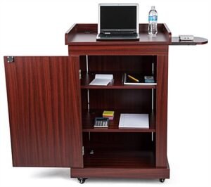 This lecture podium with cabinet is equipped with wheels and two locking doors. Front and rear lectern openings make it easy to use the internal cable management system and allow hassle-free access to any technology that may be stored on the adjustable height shelves. Use the podium with cabinet as a hostess station in a restaurant or to store classroom materials as you travel from one room of students to the next. Adjustable height shelves within the lectern can be set up to accommodate textbooks, menus, table linens, laptops, and other technology or classroom essentials. Locking wheels allow you to easily move the station from one area to the next. This mahogany podium with cabinet is sure to enhance any restaurant or classroom!