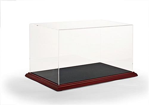 These 11″ high sports memorabilia display cases, showcases for collectibles, can hold a wide variety of objects. A large size makes these acrylic boxes particularly useful for displaying sports collectibles. A standard size basketball or football can fit with ease into these memorabilia display cases that have a wood base. A selection of autographed baseballs or hockey pucks also present well in the acrylic boxes. Additionally, a football helmet can fit inside the memorabilia display cases that sit on a shelf (check the inside dimensions listed below). The acrylic boxes for collectibles are not just for sports items, but can also show custom-built models.