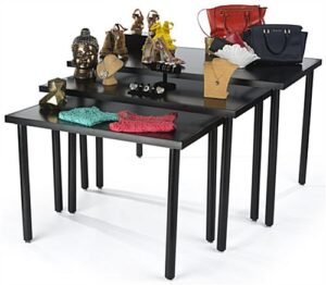 These black nesting tables provide a modern retail display for your shop. They come as a set of three that can be used as a one tiered unit or placed in different areas around your store. These versatile nesting tables have a powder coated steel frame with semi-gloss MDF tabletops for a sturdy and contemporary design. This style is perfect for clothing stores to set out a full outfit with apparel and accessories on each level. The steel frame can easily be broken down and stored by simply unscrewing the legs when needed. Each retail display includes hardware and simple instructions for an easy setup and a set of levelers to keep your merchandising sturdy. These nesting tables feature a strong design and a modern style that is sure to complement any shop.