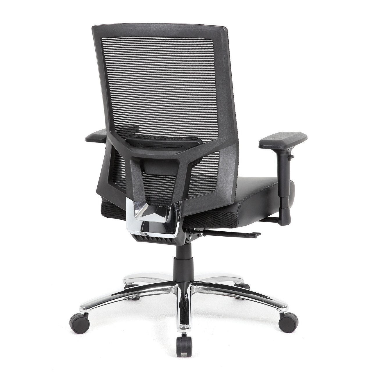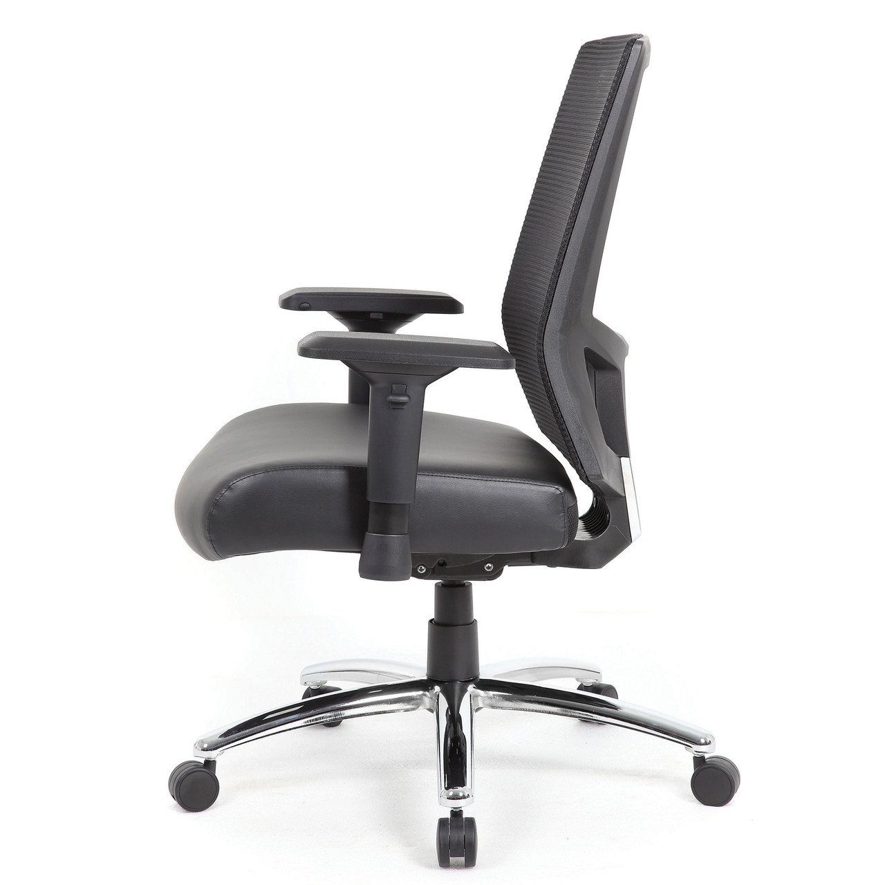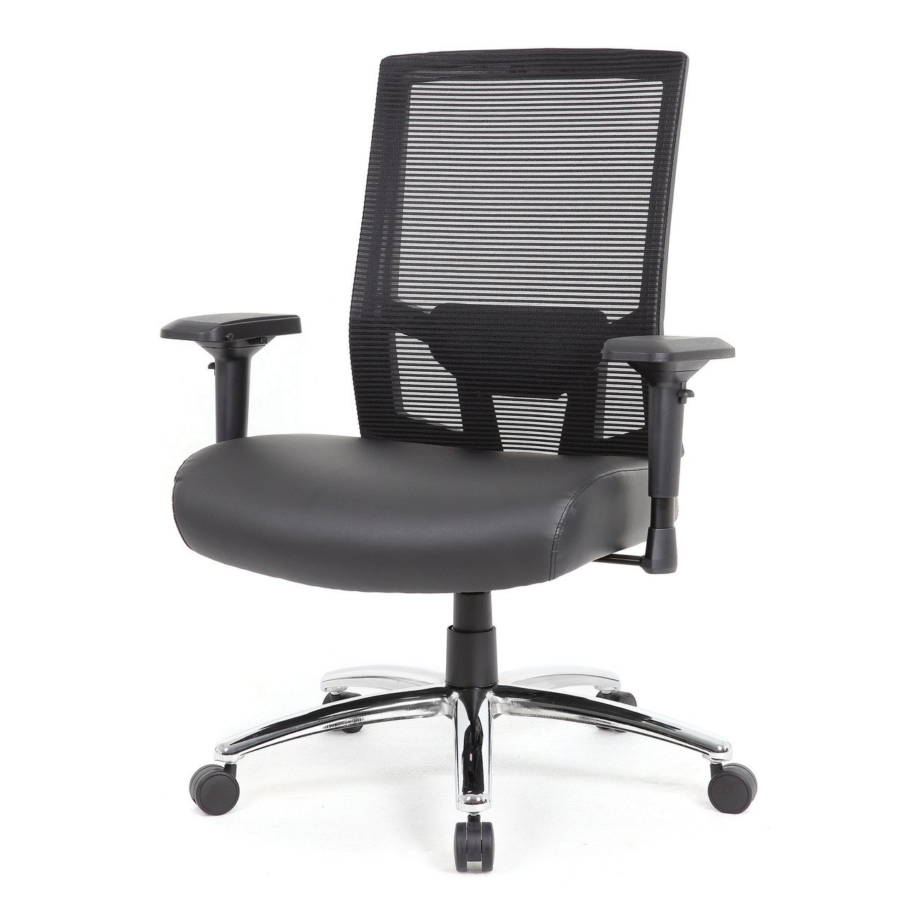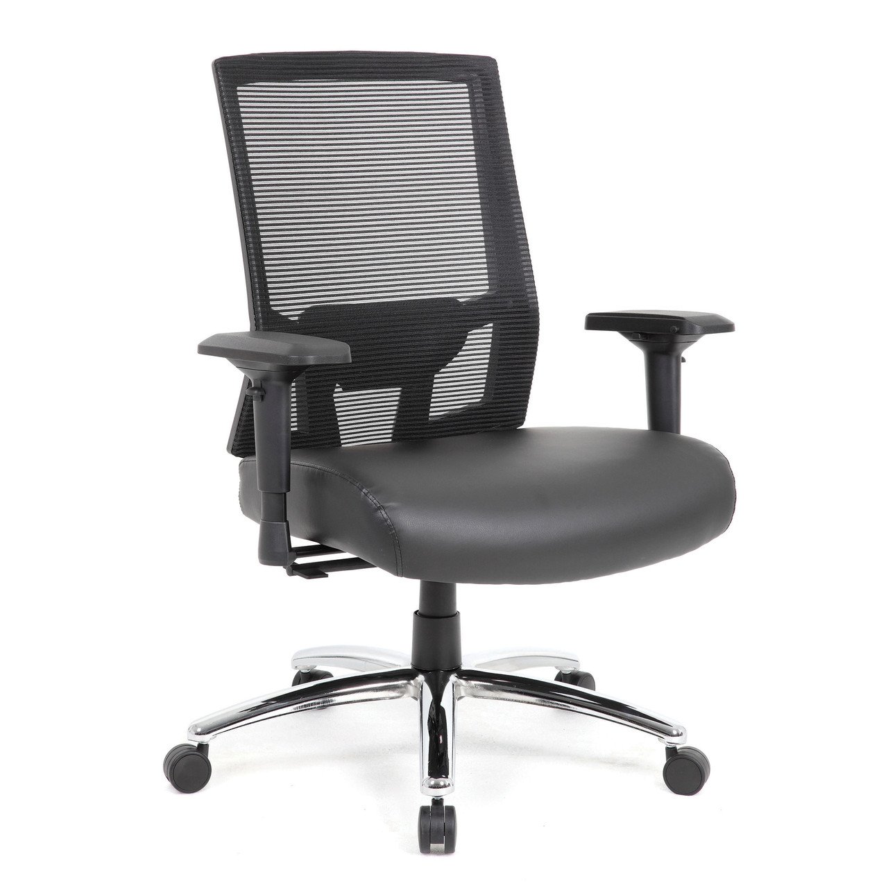 This heavy duty executive mesh chair is the perfect addition to any office, board room, or study. Its 400 pound weight capacity renders it compatible with a broad range of different body types. The seat is beautifully upholstered in black Caresoft Plus and is fitted with a durable and breathable mesh back with integrated adjustable lumbar support. The chair is as comfortable as it is durable. Additional features include height adjustable arms, a 2:1 self adjusting synchro tilt mechanism and chrome base. It also features improved pneumatic gas lift seat height adjustment. nn