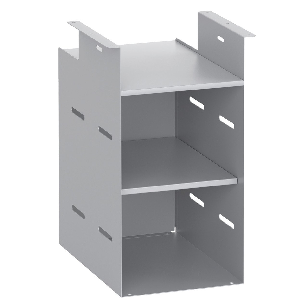 Keep your items organized with the space-saving hanging storage. The metal shelf conveniently separates the opeining into two equal spaces. The open slots are used to hang hooks or pockets.