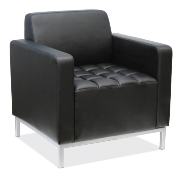 This guest chair from OfficeSource is a premium quality addition to any office workspace. Combining both elegant aesthetics and comfort, you can have something pleasing to the eye that is a joy for guests to experience. This chair comes with a high quality black faux leather upholstery, and has tufted cushion seating for added comfort. As part of the Millennial Collection, this chair also comes fully Greenguard certified. This means that you can be sure it meets current industry standards on chemical emissions, keeping your workforce and workplace safe.